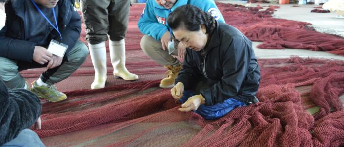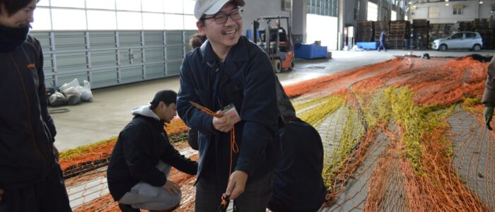倉庫についてからは実際使われている定置網漁の網の修繕作業を見学・体験をさせていただきました。